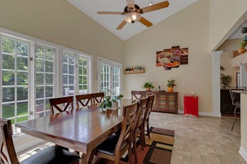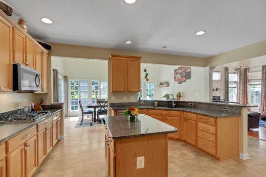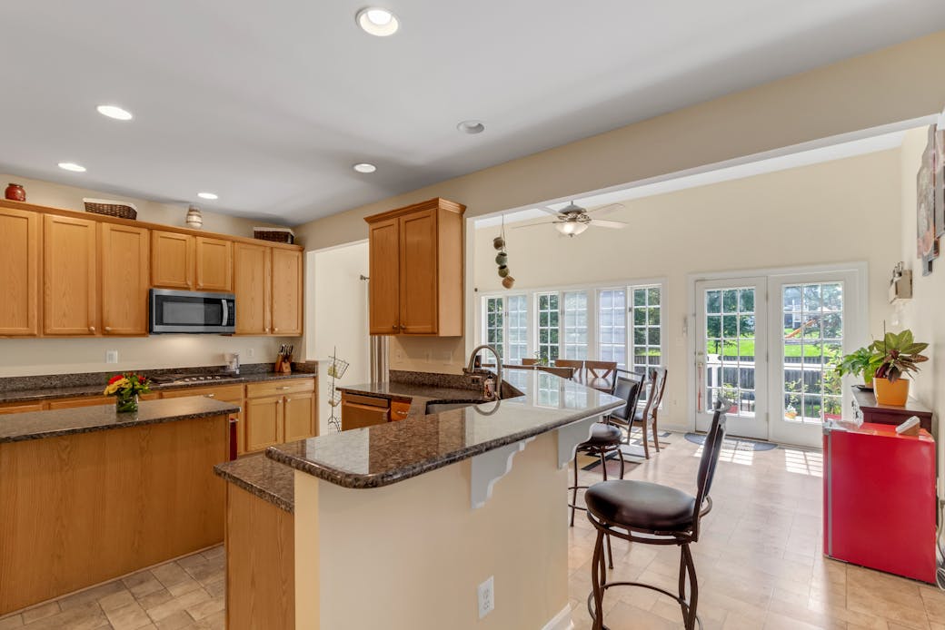 Beyond the kitchen, discover a haven of relaxation and entertainment. The spacious family room beckons you to unwind by the cozy fireplace, while French doors lead to a sunroom that overlooks the backyard oasis. As you step outside, prepare to be transported to your own private paradise.