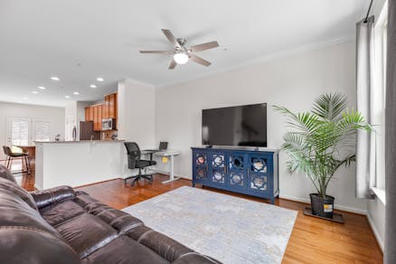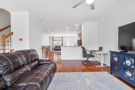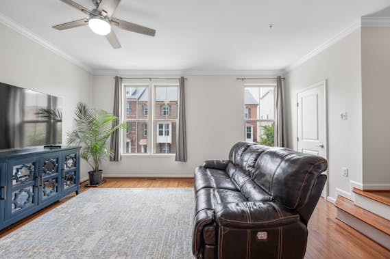 Bask in natural light in this inviting living room, featuring oversized windows, elegant crown molding, and warm hardwood floors. The plush leather seating and modern ceiling fan offer both comfort and style—creating the perfect space to unwind or entertain with ease.