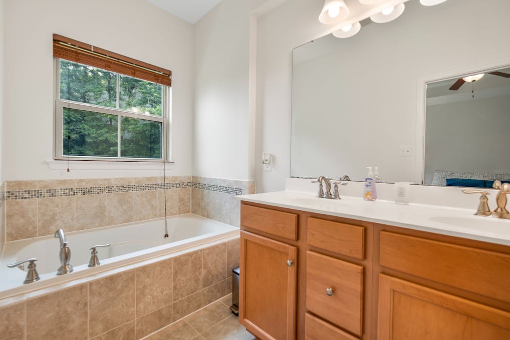 The master bedroom is a tranquil retreat with tray ceilings, elegant lighting, and a serene backyard view through wide windows. The adjoining bathroom offers a luxurious touch with a deep soaking tub, double vanity, and natural finishes that create a spa-like atmosphere.